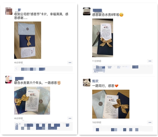 家屬參觀活動的熱情還未褪去,26日,感恩節(jié)當天,贈送賀卡活動又將感恩的情緒推向了高潮。全公司近400名員工,無論是路途較遠的區(qū)域供水服務中心亦或是各座增壓泵站,每一名員工都收到了感恩賀卡,驚喜之余更多的是感動。在二水廠,公司領導親自為員工代表贈送賀卡,并合影留念。小小賀卡,情深義重。雖寒風凜冽,卻擋不住這份融融愛心,于是,公司員工們的朋友圈沸騰了,愛心涌動,展示賀卡的同時,更多的是表達對公司的感謝、感激與感恩。