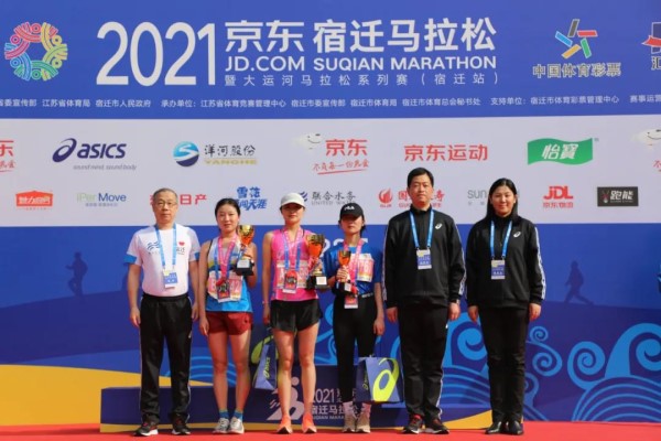在半馬終點——宿遷市奧體中心,俞偉景受邀為半馬女子項目獲獎者頒獎,對她們巾幗英雄的風采給予了高度贊揚。