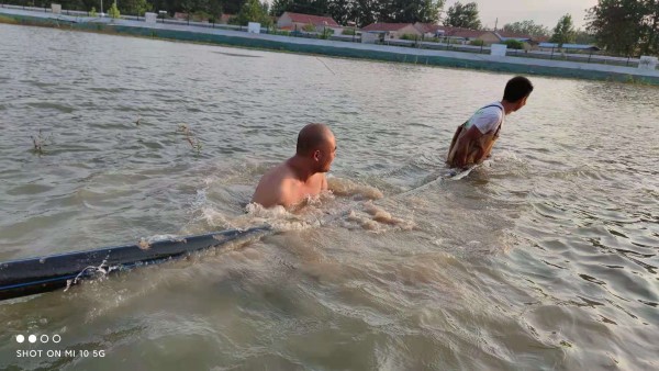 中心主維修韓小冬立刻驅車往閆集管線查找漏水點,在巡線到宿邳路邊一個魚塘處,他停住了腳步,心里暗喊:“不妙!”墉主說水位明顯增高。這是一個直徑160米的魚塘養殖基地,幾個月以前這里還是村莊,經過拆遷,成了水產養殖基地,我們的PE110管被淹埋在了魚塘里。韓小冬擺船到魚塘中心,看到水底“咕嚕嚕”冒著水花,很明顯,魚塘底的水管損壞了!當時是16:30分,天色已晚,這可把大家給難住了,管道損壞,修過埋在泥土里的、橋底、臭水溝里、水泥地坪底、柏油路底……可魚塘里管道損壞還真是第一次遇到。17:00,韓小冬告知營業廳發停水通知,做好解釋工作,又馬不停蹄趕回中心領取材料。因為水深1米多,又是水產養殖,無法抽水,唯一的辦法就是潛水作業。可是塘里水質混沌,摸得著卻看不見,如何操作?抄表員盛緒莊、抄表員兼維修工楊文、湯寧積極出動,協助主維修韓小冬與維修工王虎的維修工作,帶上工具、發電機、材料等擺船到塘中心,楊文脫掉上衣、王虎穿著皮衩,兩人在水里摸到管道,好在魚墉土質松軟,使使勁還是能從泥里拉出管道,一人站在船上用繩子系著主管道、一人用棍子插在塘里固定船避免移動,另外兩人站在水里抱管道用力拉:一下、兩下、三下……,經過將近一個小時的齊心合力,損壞管道終于露出水面,清理淤泥,再用脫下來的衣裳擦干管道上的水垢。當時已經是晚上20:00,中心想盡辦法在岸上給維修人員準備了照亮的燈光。為了能把管道拉上水面電熔住,剪掉損壞管道,只能再接上2米管道。又經過1個半小時的奮斗,搶修勝利完成,閆集村終于在21:35恢復供水。