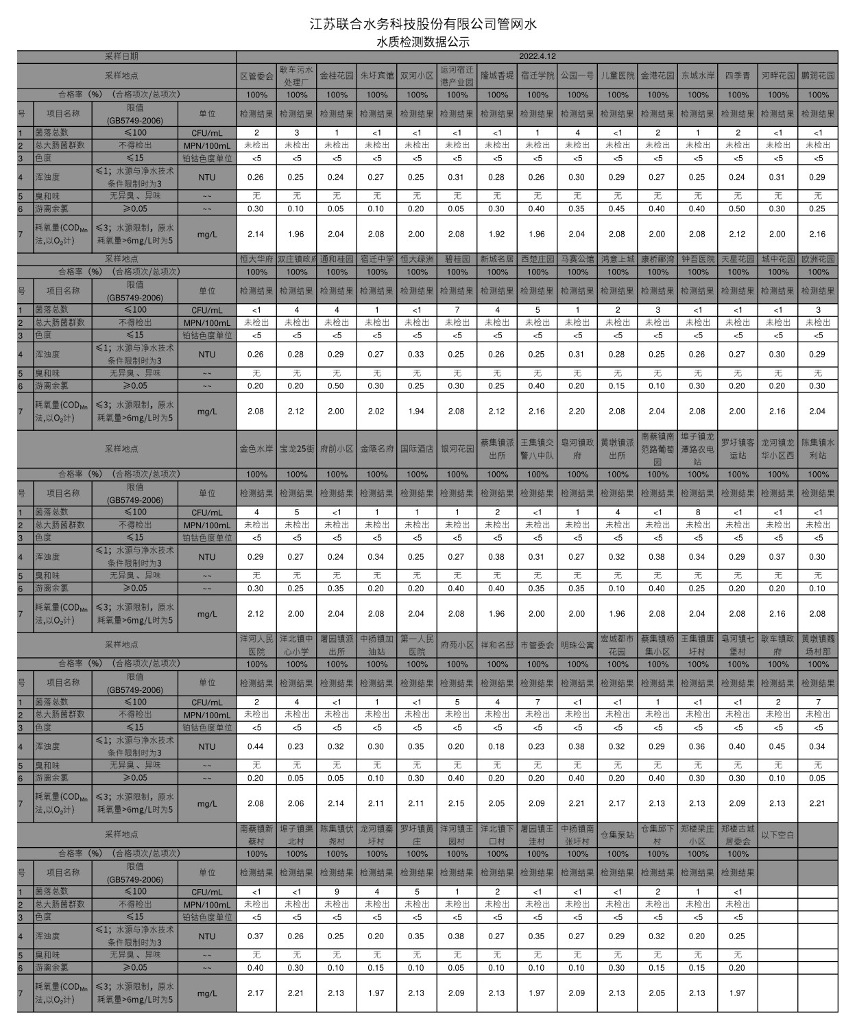 管網(wǎng)水半月公示(2022年4月上半月)