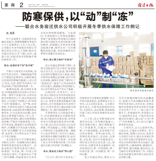 日夜防守,全力以赴保冬供;立足民生,不遺余力為群眾。護衛(wèi)城市命脈,保障人民生活,是供水人的責(zé)任與擔(dān)當(dāng),聯(lián)合水務(wù)宿遷供水公司作為宿遷市重要供水企業(yè),將充分發(fā)揮好城市供水壓艙石、穩(wěn)定器作用,以最高標(biāo)準(zhǔn)、最強組織、最嚴(yán)要求、最實措施、最佳狀態(tài),全力做好冬季防寒保供工作,為宿遷市經(jīng)濟高質(zhì)量發(fā)展和群眾高品質(zhì)生活貢獻聯(lián)合力量。