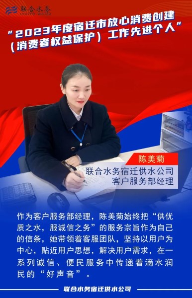 水是生命之源、生產之要、生態之基,讓用戶用上“放心水”,是聯合水務人義不容辭的責任與擔當。近日,為表彰在江蘇省宿遷市放心消費創建工作中涌現出的先進典型,充分調動各方參與放心消費創建工作的積極性,宿遷市放心消費創建活動領導小組辦公室下發了《關于表彰2023年度宿遷市放心消費創建(消費者權益保護)工作先進個人的通報》,聯合水務宿遷供水公司客戶服務部經理陳美菊被表彰為“2023年度宿遷市放心消費創建(消費者權益保護)工作先進個人。
