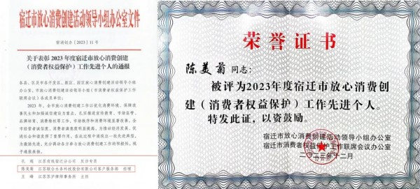 江蘇聯合水務科技股份有限公司陳美菊榮獲“2023年度宿遷市放心消費創建(消費者權益保護)工作先進個人”