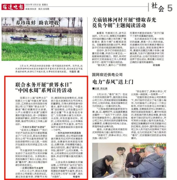 3月22日上午,聯合水務宿遷供水公司客服人員走進社區,通過發放宣傳冊、講解節水知識、提供現場咨詢等形式,向居民們介紹水資源現狀及節約用水的重要性,引導大家自覺投身到珍惜水、愛護水的行動中。“中國水周”活動期間,公司各營業大廳通過設置“節水宣傳活動專區”,為現場群眾普及水知識、水法規,并發放宣傳材料。同時,公司利用網站、公眾號等線上渠道進行節水宣傳,將節約保護水資源滲透到供水服務每一環節。