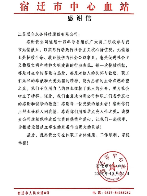 1024日,江蘇聯合水務科技股份有限公司收到了來自江蘇省宿遷市中心血站的感謝信。信中對公司主動承擔社會責任、充分展現企業擔當和對無償獻血活動的大力支持表示感謝。這不僅是對公司獻血志愿者們無私奉獻的肯定,更是對聯合水務踐行社會責任、傳遞文明正能量的極高贊譽。