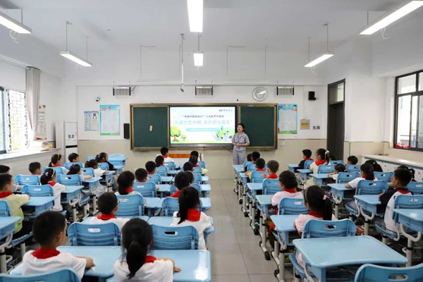 6月4日,公司志愿者們走進宿遷市青海湖路小學,開展“共建生態文明,共護碧水藍天”環保知識進校園活動。課堂上,志愿者為學生們講解了自來水的生產流程,普及飲用水安全知識,引導孩子們認識節水的重要性,樹立環保意識。互動問答、情景模擬的課堂形式,激發了孩子們的學習興趣和參與熱情,大家積極舉手、踴躍發言,用童真的語言表達對綠色未來的向往,在孩子們心中種下了環保的種子。