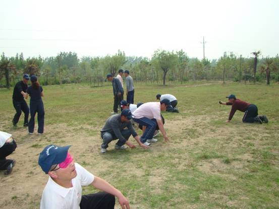 盲人方陣,是把我們每個人的眼睛罩上,然后,教練東推一個,西挪一個,將我們的位置全部打亂。地上扔幾條繩子,我們蹲下來在地上摸呀摸呀,摸到以后將幾條繩子結起來,大家握住繩子,組成最大的正方隊形。