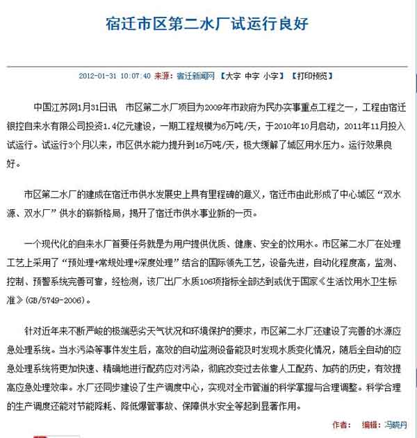 第二水廠經(jīng)過緊張施工,于2011年11月投入試運(yùn)行,運(yùn)行以來,出廠水質(zhì)完全符合《生活飲用水衛(wèi)生標(biāo)準(zhǔn)》(GB5749-2006),各類參數(shù)滿足設(shè)計要求,有效緩解了市區(qū)的供水壓力,對此,百度新聞及《江蘇新聞網(wǎng)》予以關(guān)注并報道。(附報道全文)