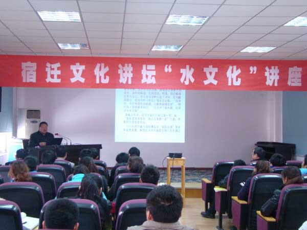 揭牌儀式后,舉行了宿遷文化講壇“水文化”講座,由宿遷學院程芳銀教授主講,程教授圖文并茂地向我們講述了宿遷水文化從古至今的發展歷程。程教授說,宿遷文化孕育于水文化,養育于水,歷練于水,是上善若水的包容文化,希望通過這次講座讓我們能領悟宿遷水文化的特色。(人事行政部袁敏)