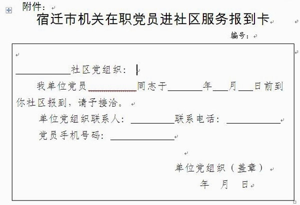 近期,市委組織部和市級機關工委聯合組織開展了市直黨組織在職黨員服務奉獻進社區活動。活動要求市直機關企事業單位黨組織的在職黨員,利用班后16小時主動到居住社區報到登記,參加志愿服務,并于6月1日起,持“宿遷市機關在職黨員進社區服務報到卡”(如下圖)到居住地的社區報到。