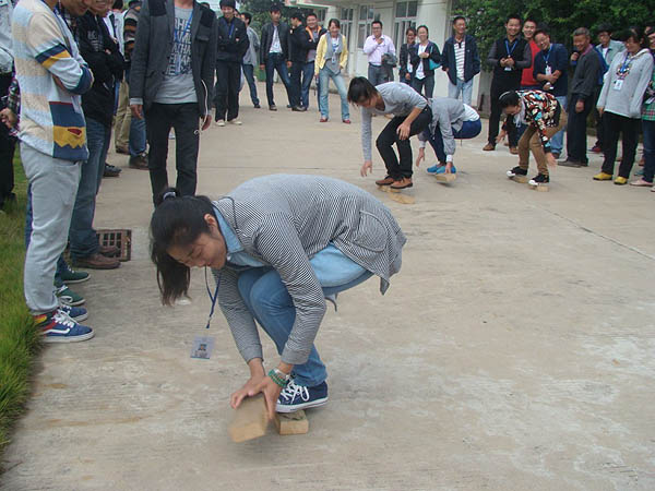 在“仙人指路”環節中,我們在既定的比賽道路上利用平時的辦公設備設置層層路障,要求各參賽小組用布條將每組其中一位隊員雙眼蒙住,另一位隊員以口令的形式指揮隊友繞過障礙物,最終到達終點,此項活動考驗選手的默契程度和方位感。同時為增強此項活動的趣味性,比賽要求必須是男女搭配,最終人事行政部孫博、姜輝以1分59秒的成績取得第一名。