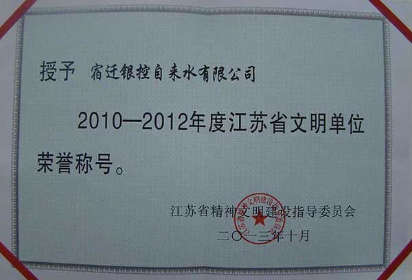 近日,宿遷銀控自來水有限公司被江蘇省精神文明建設指導委員會授予“2010-2012年江蘇省文明單位”的榮譽稱號,這是繼今年7月份被授予市級文明單位之后,宿遷銀控自來水有限公司在公司文明建設上的又一里程碑。