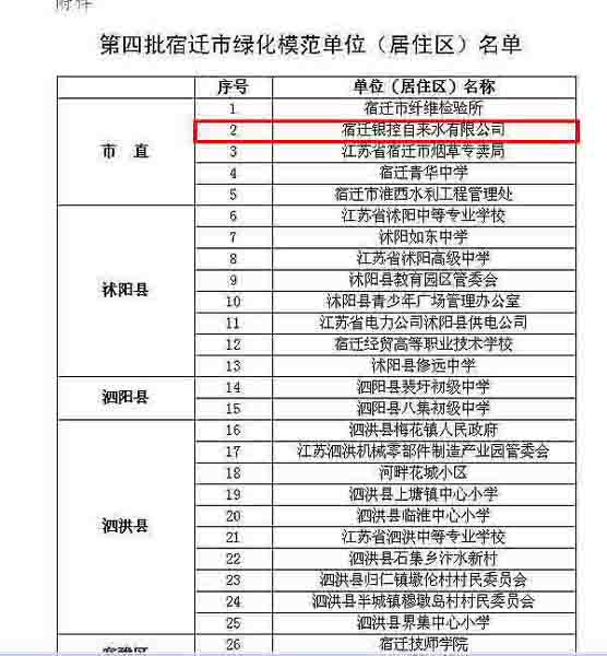 近日,宿遷銀控自來水有限公司被宿遷市林業(yè)局授予“宿遷市綠化模范單位”稱號(hào),成為全市36家“綠化模范單位”之一。