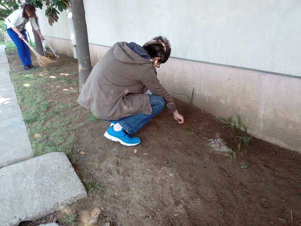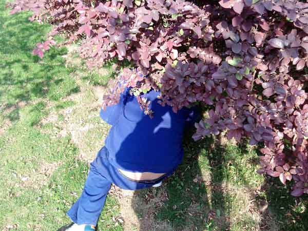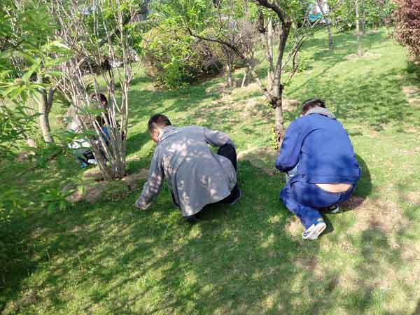 一些低矮的灌木叢中,也很容易產生雜草,清理起來很不容易。于是,我們就優先照顧身材比較小巧的同事,請其入甕,鉆入叢中除草。看著他鉆進去時的呲牙扭嘴的樣子,哎,同志,為了咱們的除草事業您辛苦了。