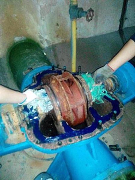 5月8日下午,已經(jīng)臨近下班時間,機(jī)電設(shè)備部接到運(yùn)河泵站值班人員反映水泵出水量偏小,考慮到馬上就到了下班用水高峰階段,為了不影響市民的正常用水,部門經(jīng)理決定錯開用水高峰時段,安排維修人員于晚上十點(diǎn)鐘開始到現(xiàn)場進(jìn)行問題排查解決。當(dāng)晚十點(diǎn)鐘維修人員準(zhǔn)時到達(dá)現(xiàn)場展開維修工作,初步判斷是四號機(jī)組泵體存在故障問題。果不其然,打開水泵泵殼檢查后發(fā)現(xiàn),泵體的葉輪被大量異物堵塞。查明故障原因后維修人員立即采取行動,清除纏繞在葉輪上的異物,同時為水泵更換上了新的盤根,解決了水泵的漏水的問題。經(jīng)過維修人員的維修,運(yùn)河泵站四號機(jī)組恢復(fù)正常工作,水泵出水量達(dá)到供水要求。