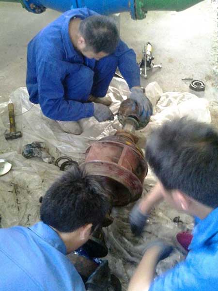 5月28日下午,機電設備部對前期發現的一水廠送水泵房4號水泵異聲進行了確認。通過拆卸檢查發現軸承磨損厲害,需要更換,另外葉輪也有部分損壞且出現裂紋,需要更換葉輪。當天,從13:00,機電設備部人員開始對受損器件進行拆卸、摸潤滑油、更壞,工作一直持續到20:00(因葉輪卡片需要外加工)終于完成水泵復原,送電運行效果良好。
