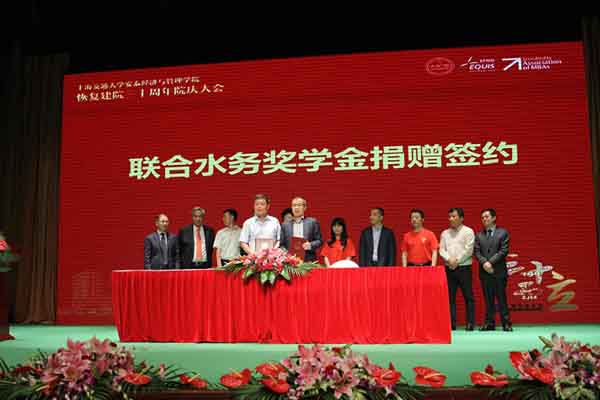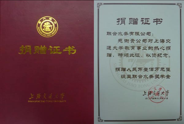 2014年6月11日上午,上海交通大學安泰經濟與管理學院恢復建院三十周年院慶大會期間,聯合水務集團董事長兼總裁俞偉景先生與上海交通大學副校長張安勝先生簽署捐贈協議,聯合水務集團捐贈壹百萬元設立“上海交通大學聯合水務獎學金”。張校長代表上海交通大學向俞偉景總裁頒發捐贈證書。出席簽約儀式的嘉賓有:上海交通大學前黨委書記馬德秀女士、安泰經濟與管理學院院長周林先生、黨委書記余明陽先生、上海交大教育發展基金會秘書長馬磊先生等;聯合水務集團副總裁劉猛先生、副總裁陳樵先生、人力資源行政總監楊麗霞女士等。