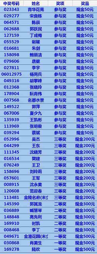 恭喜中獎的客戶,同時也感謝大家關(guān)注我公司微信平臺。公司將以多種方式向社會公布中獎名單,請中獎的客戶于2014年9月30日前攜帶中獎水費編號對應的房產(chǎn)證明、戶主身份證至宿遷銀控自來水有限公司營業(yè)廳(幸福北路128號)領(lǐng)取獎金,水費編號為8位數(shù)的洋河新城客戶攜帶資料前往洋河區(qū)域供水服務中心營業(yè)廳(酒街北門)領(lǐng)取獎金。