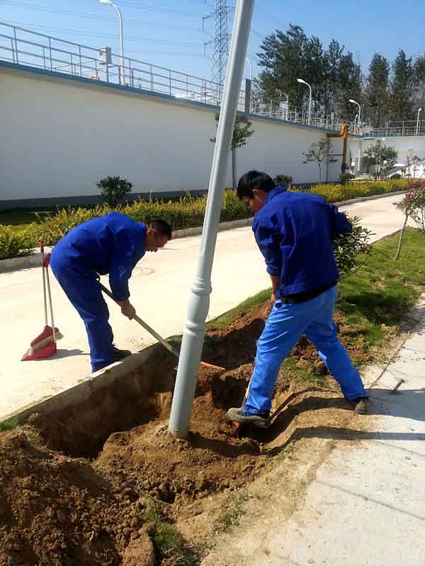 行走在城北污水廠的小道,面對著整潔,舒適的廠區環境,讓人沁人心脾。但美中不足的是,九月份的大雨讓城北污水處理廠的路燈桿歪曲了幾根,嚴重影響廠區環境的美觀。遠在福建的施工單位,一時間趕不過來。為了廠容廠貌更加美好,城北廠幾名員工,決定自己動手,將傾斜的路燈桿扶正。大家帶上鐵鍬,笤帚來到傾斜的路燈下。先是將路燈下的草坪成塊的鏟起來放在一邊,然后開挖,由于路燈基是混凝土整澆,因而開挖非常困難。不一會兒,大家就都汗流浹背。挖了四十分鐘的時間,終于可以撼動路燈桿,然后全員用力,兩個人推著路燈桿,一個人往路燈桿下面填補碎石。終于將路燈桿扶正,最后回填土壤,鋪上草坪,把濺到水泥地坪上的泥土,清掃干凈。面對著扶正的路燈桿,仿佛挺直了腰桿,向我們表示由衷的感謝!