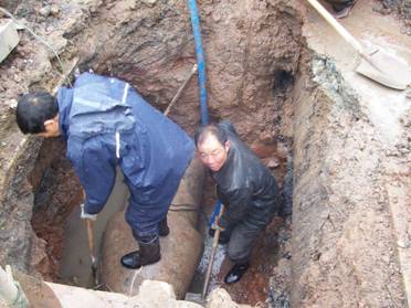 由于該處管道已長達20多年之久,管道深達2米之多,同時,管道東側還有新鋪設的DN800原水管道,地下管線復雜,無法進行機械開挖。管網搶修人員只得借用工具一點一點地人工開挖。