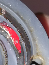 第二天巡檢時發現余氯分析儀再次出現故障,便將控制器和傳感器的電器連接部分全部檢查了一遍,并沒有發現問題,一時間有些無從下手,便停下來耐心排查線路,發現分析儀電流很大,達到兩百多微安,便懷疑是傳感器有問題,將傳感器拆下后仔細觀察才發現,傳感器的電極之間有些非常難發現的磨損接觸。將接觸部分處理掉,進行重新標定,故障排除,儀表終于顯示正常。