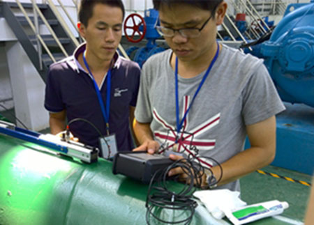 8月25日,水表檢定中心和安信電磁水表技術員對二水廠8臺管式電磁流量計進行在線測試,現場安信技術員采用便攜式超聲波流量計進行比對。經過定時間、定口徑測試,8臺出廠水流量計與超聲波流量計誤差在正常范圍內,流量計各項數據顯示穩定正常。測試結束后,安信水表技術員與水表檢定中心檢定員在檢定室對電磁水表檢定相關細節進行討論和交流,同時對電磁水表異常判斷做了詳細的講解。