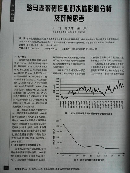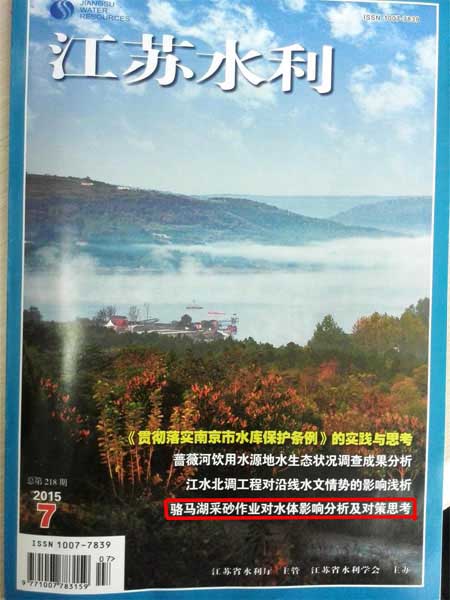 近期,宿遷公司水質檢測中心經(jīng)理葉慎忠主筆的論文《駱馬湖采砂作業(yè)對水體影響分析及對策思考》刊登在《江蘇水利》2015年第7期,總第218期。《江蘇水利》是江蘇省水利學會主辦,服務于江蘇水利現(xiàn)代化建設、以促進水利事業(yè)發(fā)展、大力推進水利科技進步的刊物。