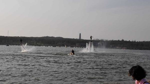 來到鏡湖,碧波蕩漾的湖面倒影著自然山林,形成山水相交輝映景觀,讓人忍不住感嘆大自然這么美,10點我們準時到觀眾席,等待著節目開始。伴隨著動感的音樂和激情的演說,表演開始了,四名運動員駕駛著摩托艇駛入鏡湖,他們一會潛入水底,一會將摩托艇半身沒入水面,像海豚一樣原地站在水面,嫻熟的技巧和高超的表演贏來觀眾的陣陣掌聲。接著四名水上飛人運動員踩著水柱騰空而來,引來觀眾陣陣呼聲,他們通過水的噴射力在湖面上行走自如,做著后空翻等高難度的動作,讓現場觀眾看得目不轉睛。