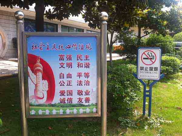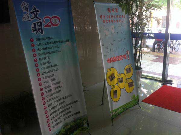 首先,加強氛圍營造。公司通過張貼海報、宣傳標語、制作宣傳欄、公司網站、微信平臺、LED屏等方式進行宣傳。如在營業大廳擺放我公司推行創文工作掠影,設置“做文明有禮宿遷人”簽名墻和“今天你文明了嗎?”曝光欄、1米線等;利用營業廳LED屏和電視分別播放文明20條標語和動畫,營業廳內和辦公區域張貼“禁止吸煙”等標示;公司綠化帶及外墻分別樹立和張貼“社會主義核心價值觀”標語,多方位宣傳營造了濃厚的文明氣氛。