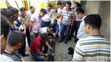 培訓中,廠家技術(shù)人員詳細地介紹了鋼絲骨架PE復合管主要技術(shù)性能指標、各類電融管(配)件融接時間和操作要領(lǐng),重點講解3級融接管件的對接方法和注意要領(lǐng)。特別是前期的刮磨表層、清潔灰塵雜物、承插到位、焊接后冷卻等問題進行了示范講解,同時,針對我公司人員提出的管道搶修能否帶水作業(yè)和作業(yè)應該注意事項等問題,祥生新能源技術(shù)人員也進行了詳細地解答。在講解操作過程中,大家學習熱情高漲,用心聆聽、仔細體會、積極提問,工程施工管理員宋向勇成功地完成一個φ160電融平節(jié)的對接操作,并得到了廠家技術(shù)人員的肯定。
