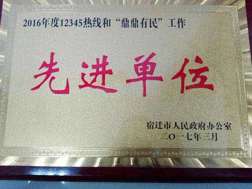 為表彰先進(jìn)、樹立榜樣,切實(shí)提高電子政務(wù)辦理水平,宿遷市人民政府辦公室對2016年度在宿遷市電子政務(wù)工作取得優(yōu)秀成績的企事業(yè)單位進(jìn)行通報表彰,宿遷公司榜上有名,被授予“2016年度12345熱線、鼎鼎有民工作先進(jìn)單位”榮譽(yù)稱號。