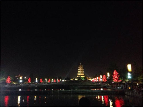 等我們趕到的時候,廣場上已經站滿了游客。站在我們身前的是兩個來自烏克蘭的高挑的美女留學生,一八三的我都要稍稍墊腳才可以不被兩個姑娘擋住。音樂噴泉升起的時候,水珠四散,兩個姑娘不住驚呼“Oh,My God!”。噴泉升起,再加上安裝在廣場上五顏六色的彩燈發出的光芒,遠處是一千多年的歷史的大雁塔,歷史的厚重和現代的時尚巧妙地融合在了一起。留給所有見證過這一幕的人們一個曼妙美麗的回憶。