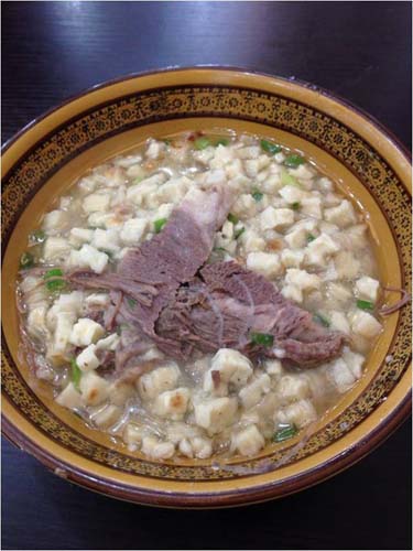 久負盛名的回民街就在鐘鼓樓廣場的不遠處,我們正是饑腸轆轆的時候,正好可以到這個早已經如雷貫耳的美食街上大快朵頤一番。陜西正宗肉夾饃、羊肉泡饃、秦正涼皮、岐山臊子面、大串的烤面筋,好像一時間自己的味蕾和嗅覺已經完全不夠用了。第一次真正見識到西北人民粗獷豪邁的吃食,已經來不及去感慨華夏幾千年來歷史給這片西北土地的豐厚饋贈了!從古老的建筑遺跡到傳承不歇的秦腔古調,還有這些令人一想到名字都會覺得垂涎欲滴的美食。我們糾結于究竟要選擇哪一家美食很久,終于選定了一家賣羊肉泡饃的店,老板操著一口地道的關中方言給我們介紹店內的美食,最終我們要了三碗羊肉泡饃和十串烤面筋。羊肉泡饃做得料重味醇,肉爛湯濃,肥而不膩。烤面筋是香辣有味,入口酥脆。現在想來仍然覺得口水直流。