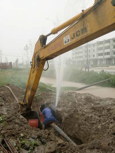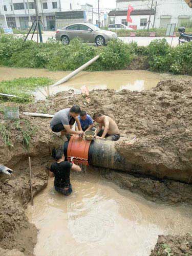 為保證下游鄉鎮正常用水,現場決定不停水作業。由于該處管道位于路邊排水河邊,河道底部淤泥較深,而且主管網壓力較大,水流打在手臂上都會有刺痛感,這些都給搶修進度帶來很大的影響。為保證安全有效,利用挖機將河道圍堵防止水流倒灌,清除有塌方危險的土層保證維修員人身安全。當天室外十分悶熱,太陽毒辣,操作坑內悶熱難耐,大家排除萬難,歷時4個小時出色完成搶修工作。