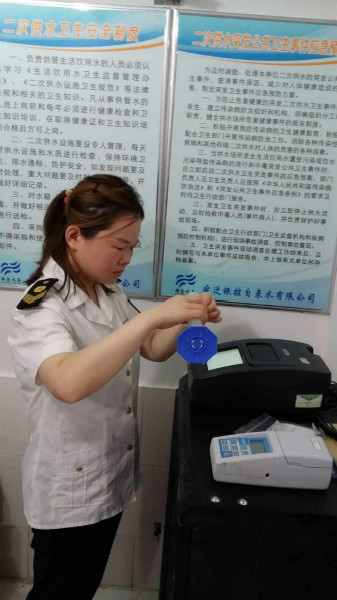 近日,宿遷市衛(wèi)生監(jiān)督局行政執(zhí)法大隊對我公司所管理的二次供水泵房進行專項檢查。檢查內(nèi)容包括,二次供水所有涉水產(chǎn)品的衛(wèi)生許可批件、水箱清洗消毒記錄臺賬、泵房內(nèi)衛(wèi)生環(huán)境管理等方面,同時還現(xiàn)場取水檢測渾濁度、游離性余氯、PH值等。