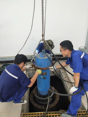 周一剛上班就接到制水部的維修單,維修單內容是二水廠提升泵房1#提升泵報警,無法開機,目前正值高峰供水期間,一臺提升泵無法運行就會導致溢流,任務嚴峻,機電部全員出動,先將報警的提升泵提上地面,檢測阻值為零,確認內部油室進水,已無法使用,必須返廠維修,但是這并沒有難倒我們,因為為了保障高峰供水,機電設備部提前將可能出現(xiàn)影響生產(chǎn)的故障羅列出來,提前準備備品備件,確保生產(chǎn),提升泵就在故障考慮之內,所以提升泵已提前采購一臺已做備用,現(xiàn)在出現(xiàn)這個情況,機電部搶修人員安裝新的提升泵并進行調試,保障了生產(chǎn),隨后會將故障提升泵返廠維修當作以后的備用泵使用。
