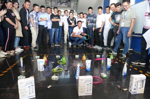 第二個環節是單人項目“運送小球”。參賽隊員通過吸管吸住乒乓球(比賽全程不得用手觸碰乒乓球,運球途中,乒乓球落地,則返回原地重新開始)將乒乓球送到指定地點杯中,賽程2米,2分鐘時間內運送乒乓球的個數計為成績。4人一組同時比賽。剛開始,財務部經理許應濤以13球的好成績暫居第一,他正沾沾自喜,后邊的選手卻不服氣揚言要挑戰,嬉笑斗鬧,如火如荼。果然,第四組次,皂河服務中心韓小東以16球打破紀錄,許經理眼看奪冠無望,在大家調侃聲中“灰溜溜”離場。接下來的比賽現場,熱鬧依舊,一個個隊員屏住呼吸,憋住氣,全神貫注地運球,完全進入忘我狀態,但是也有很多人經不住場外人員的玩笑逗鬧,忍不住笑起來,小球就趁機逃脫了,技術部薛江寧經理就屢屢中招,每到中途球就掉落,慌忙去逮球,不時惹得在場人員捧腹大笑,最終也沒能實現“零”的突破。而同組次的徐曉猛,卻是一匹“黑馬”,成功送進17球,拔得頭籌。結果是其次的,重要的是歡樂開懷、努力拼搏的過程。