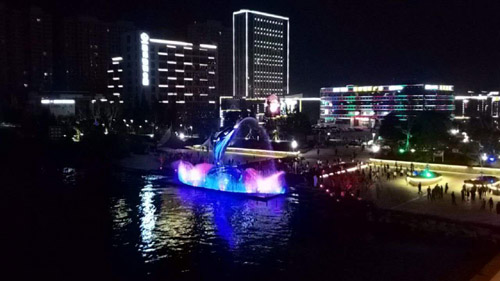 運河兩岸人來人往,風光美景映入眼簾,每當殘陽閉幕,夜便悄悄的落了下來。這里原本是附近居民散步的地方,在政府的大力投資下變成了市民游玩的圣地,傍晚這里燈火通明人山人海,這里有整齊有序的勁走團,有打的熱火朝天的籃球、羽毛球愛好者,還有歡天喜地的孩童們,娛樂設施的增加讓這里充滿了活力,這里是餐后散步的最佳選擇,每天橋下有許多的象棋、圍棋愛好者坐在桌邊,探討著下一步的走勢,還有許多的小伙伴們在你來我往的打著乒乓球,樹蔭下的小椅子上坐著對對情侶,他們在說悄悄話呢。一號橋北邊有一坐風光帶的象征建筑——銀色的大鯉魚,20:00之前還有美麗的噴泉哦。
