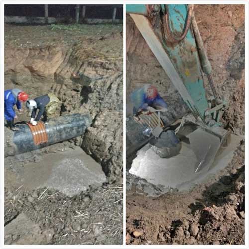 按照韓經理指示,根據現場開挖的漏水點確定材料,隨后又電話聯系倉庫準備材料。材料準備好后,韓經理和劉安柱將材料送到現場,一切就緒后,著手維修。因操作坑泥漿較多,搶修難度較大,經過3個多小時的冒雪搶修,終于將漏水點修復完畢。