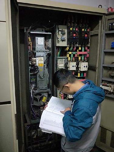 (圖1:機電設備部人員正在現場查找變頻器參數)