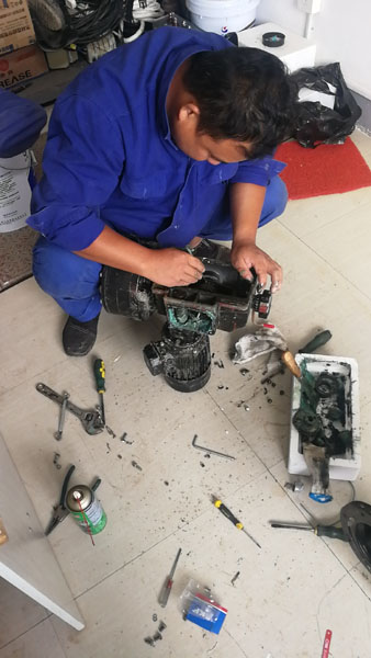 此次檢修,重點(diǎn)解決前期不具備維修條件但對(duì)生產(chǎn)有重要影響的設(shè)備,并結(jié)合廠內(nèi)各種設(shè)備使用率、運(yùn)行時(shí)間的時(shí)長(zhǎng),來(lái)確定設(shè)備最佳運(yùn)行參數(shù)。此次巡檢過(guò)程中發(fā)現(xiàn)加礬泵不能夠正常加藥,機(jī)電部當(dāng)即啟動(dòng)備用泵,隨后對(duì)損壞加礬泵拆解。原來(lái)是磨片損壞,機(jī)電部立即申請(qǐng),聯(lián)系廠家發(fā)貨。