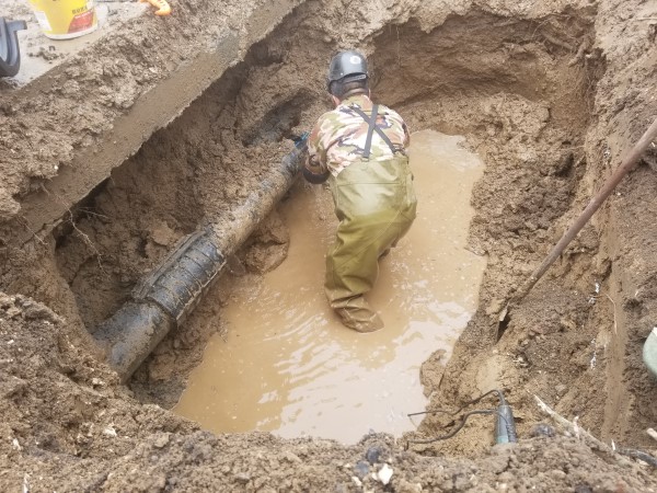 3月14日宿遷氣象臺發(fā)布了大風(fēng)8級黃色預(yù)警。窗外狂風(fēng)大作、嘶吼著。供水人頂著狂風(fēng)細(xì)雨奔波在千家萬戶。龍河區(qū)域供水中心的維修師傅朱純培在完成工單后,回家的路上也不忘巡查管線,突然他發(fā)現(xiàn)古西村村部附近水泥路邊有一處積水,水質(zhì)清澈,頓時提高了警惕,懷疑可能是自來水。經(jīng)現(xiàn)場查看后確定是自來水,隨后立即向中心領(lǐng)導(dǎo)匯報,趙主任和陳國興帶著維修所需材料到達(dá)現(xiàn)場進行搶修指揮。由于管道預(yù)埋比較深,人工無法開挖,只有使用挖掘機進行挖掘,使用機械挖掘很容易造成二次管道破壞,需要人和機器相互配合。人工確定可挖掘深度,再使用挖掘機一點一點清理。管道損壞處的土質(zhì)長時間在水中浸泡極易造成塌方,給人帶來人身安全威脅,使現(xiàn)場的搶修壓力、難度驟然上升。大家的通力合作,最終找到漏水點,DN200管道處遭嚴(yán)重破損,清澈的水向外流。維修師傅不畏疫情帶來的困難,不畏狂風(fēng)下雨,爭分奪秒實施搶修,經(jīng)過約3小時的緊張作業(yè),在挖機和師傅的相互配合下裝好了哈夫節(jié),完成了搶修任務(wù),保障了居民生活的正常用水。